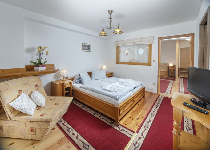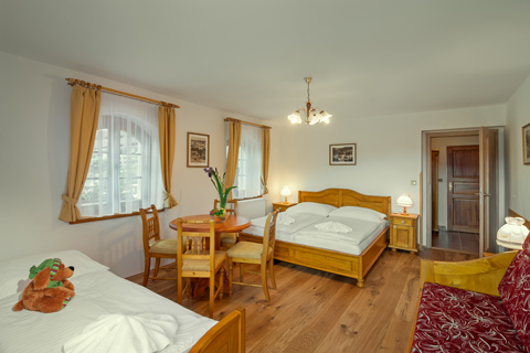 Wir bieten Ihnen eine ganzjährige Unterkunft in Doppelzimmern mit der Aufbettungsmöglichkeit und in Familienappartements mit eigener Küche, Schlafzimmer und einem Wohnzimmer. Die geräumigen Komfortzimmer sind mit massivem Stilmöbel aus Naturmaterialen eingerichtet.